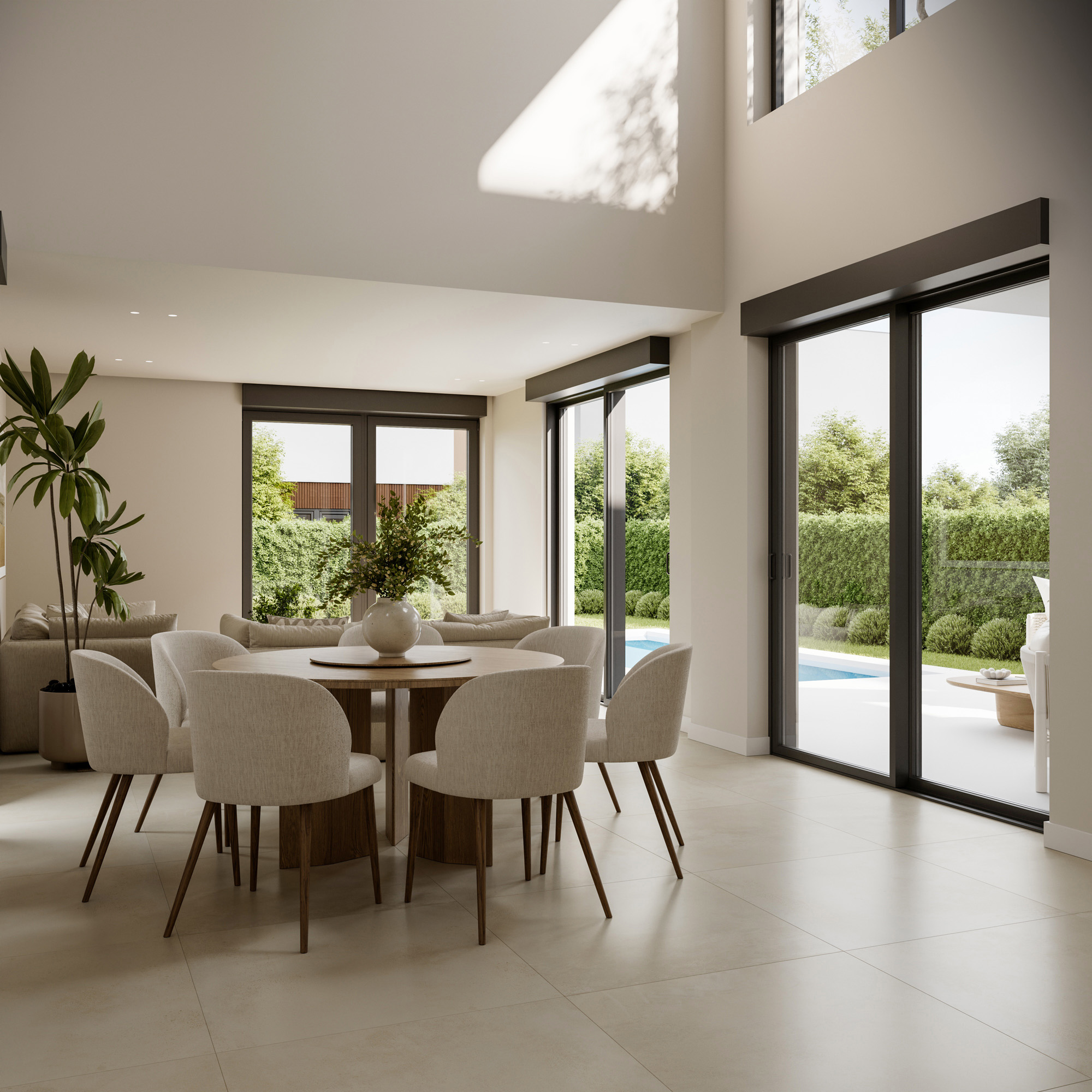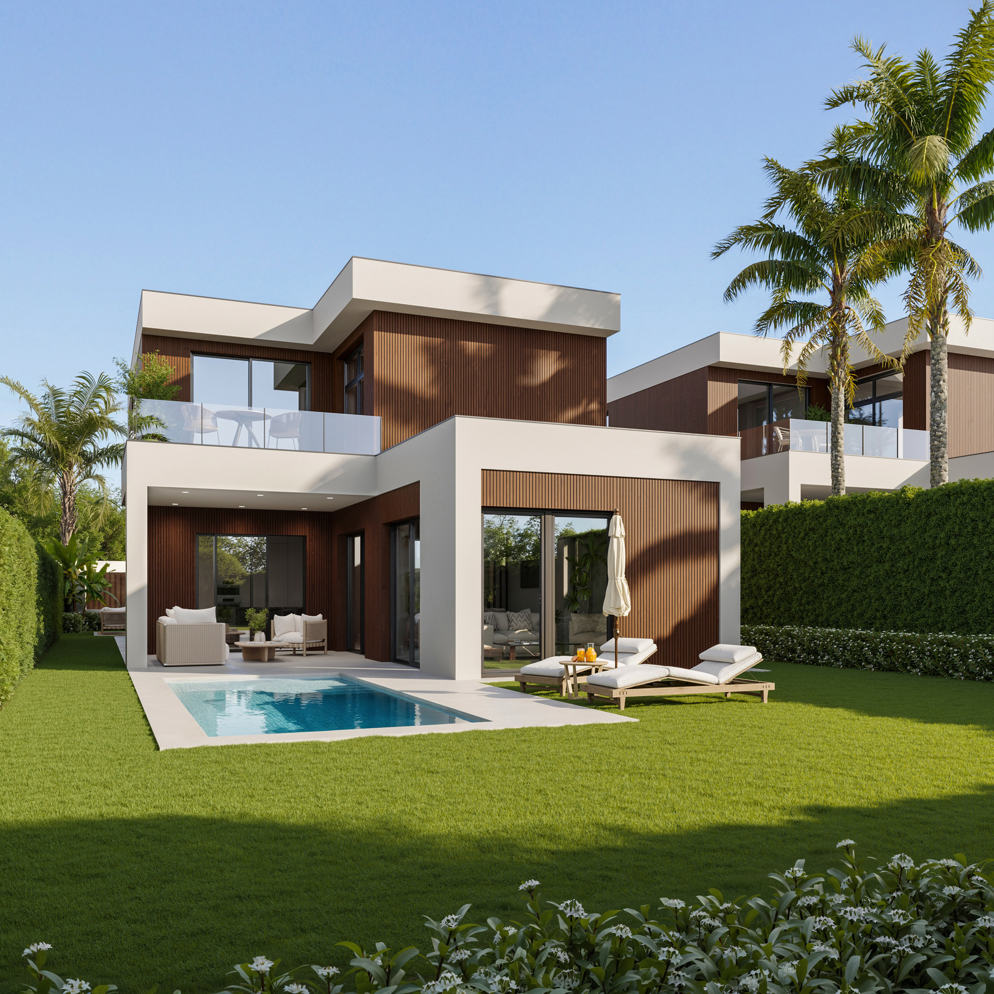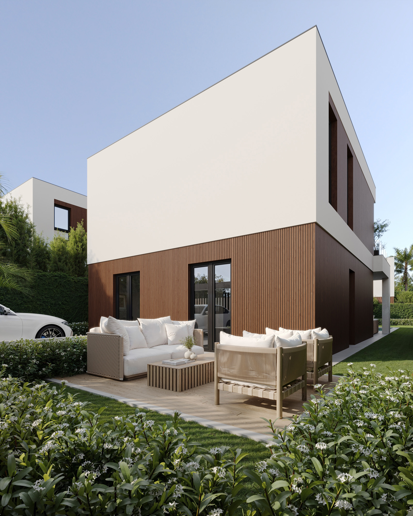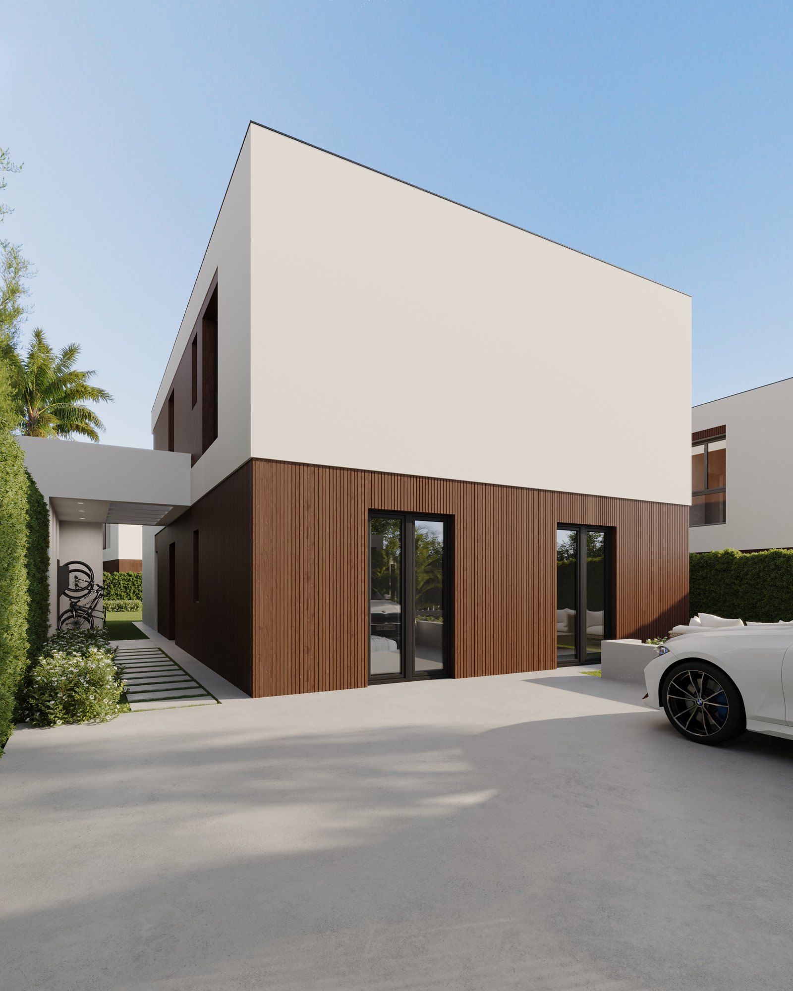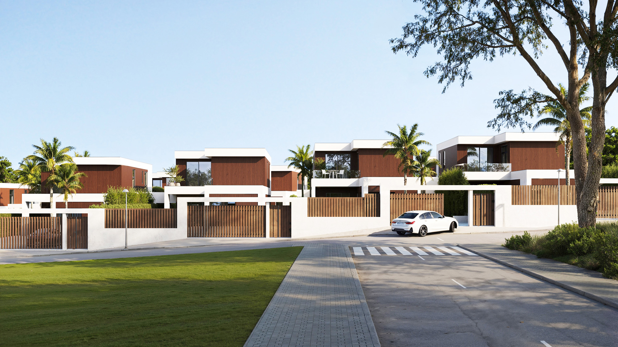 Proyecto de visualización 3D para un conjunto de 10 viviendas unifamiliares de estilo contemporáneo situadas en Valencia.