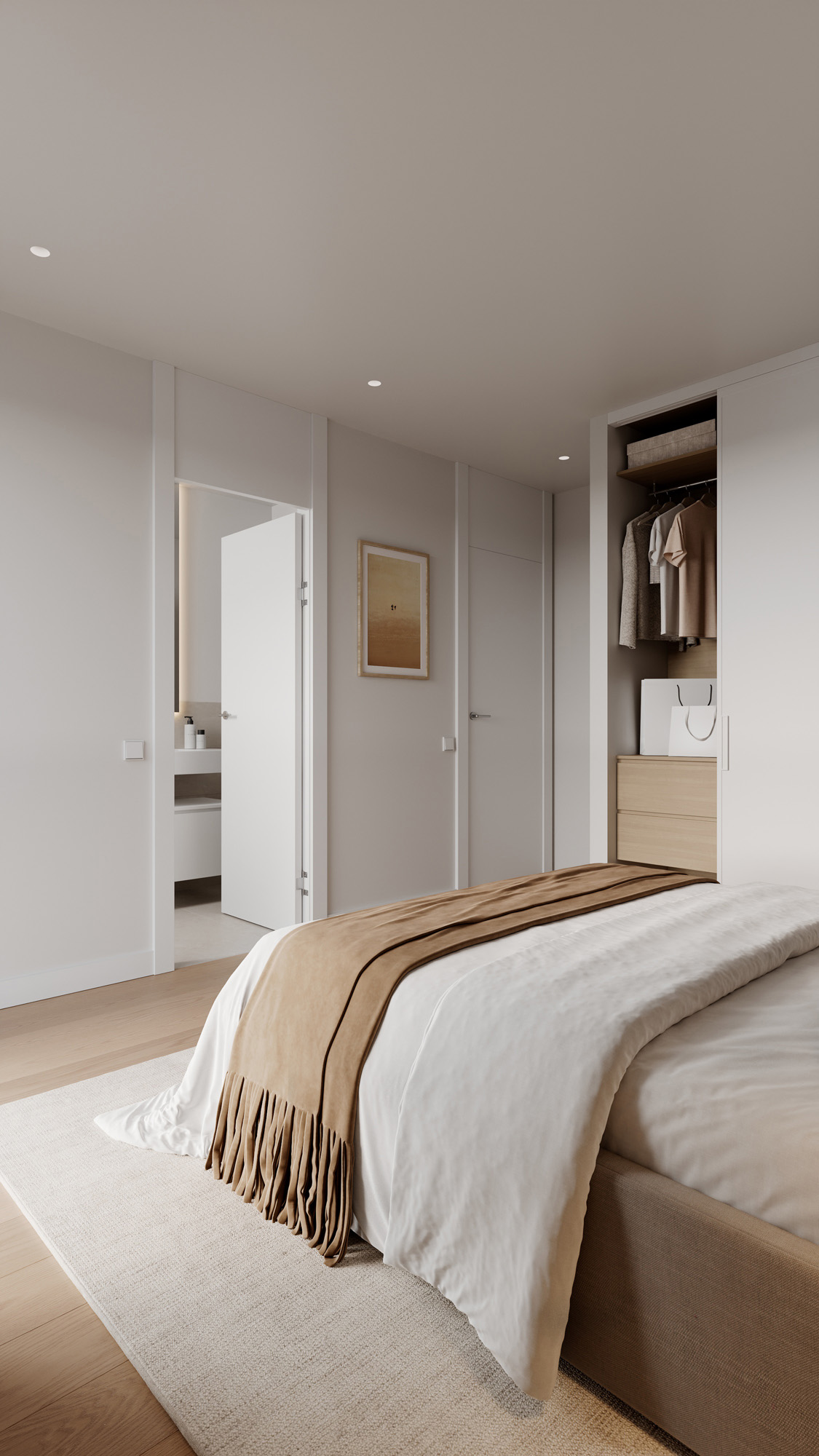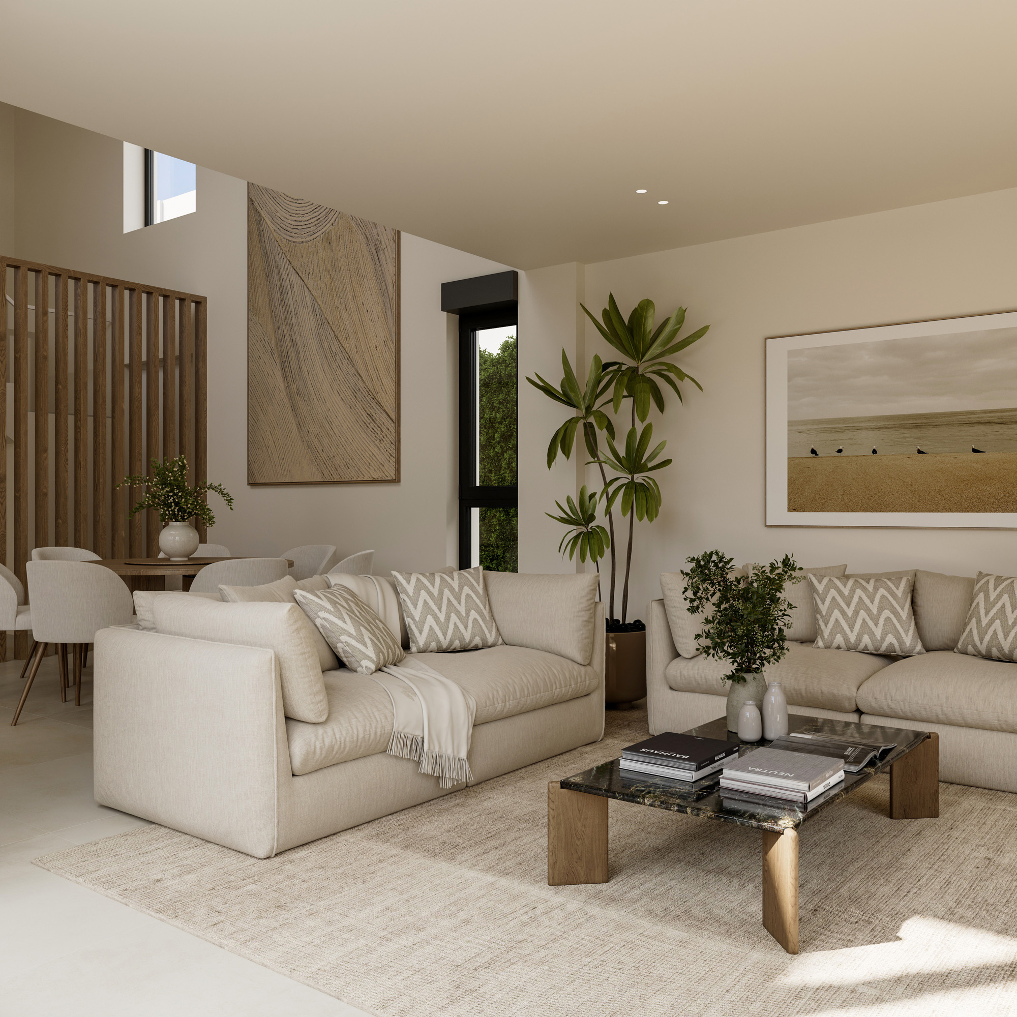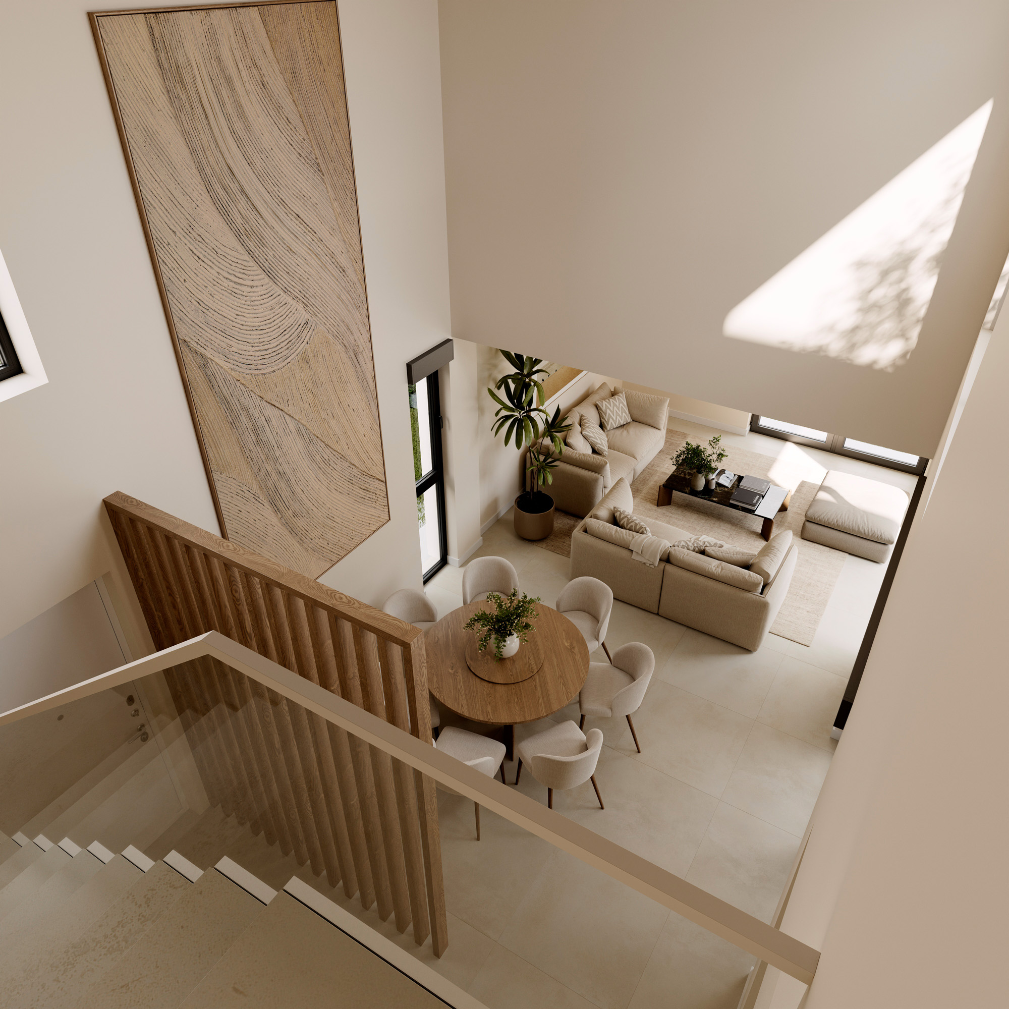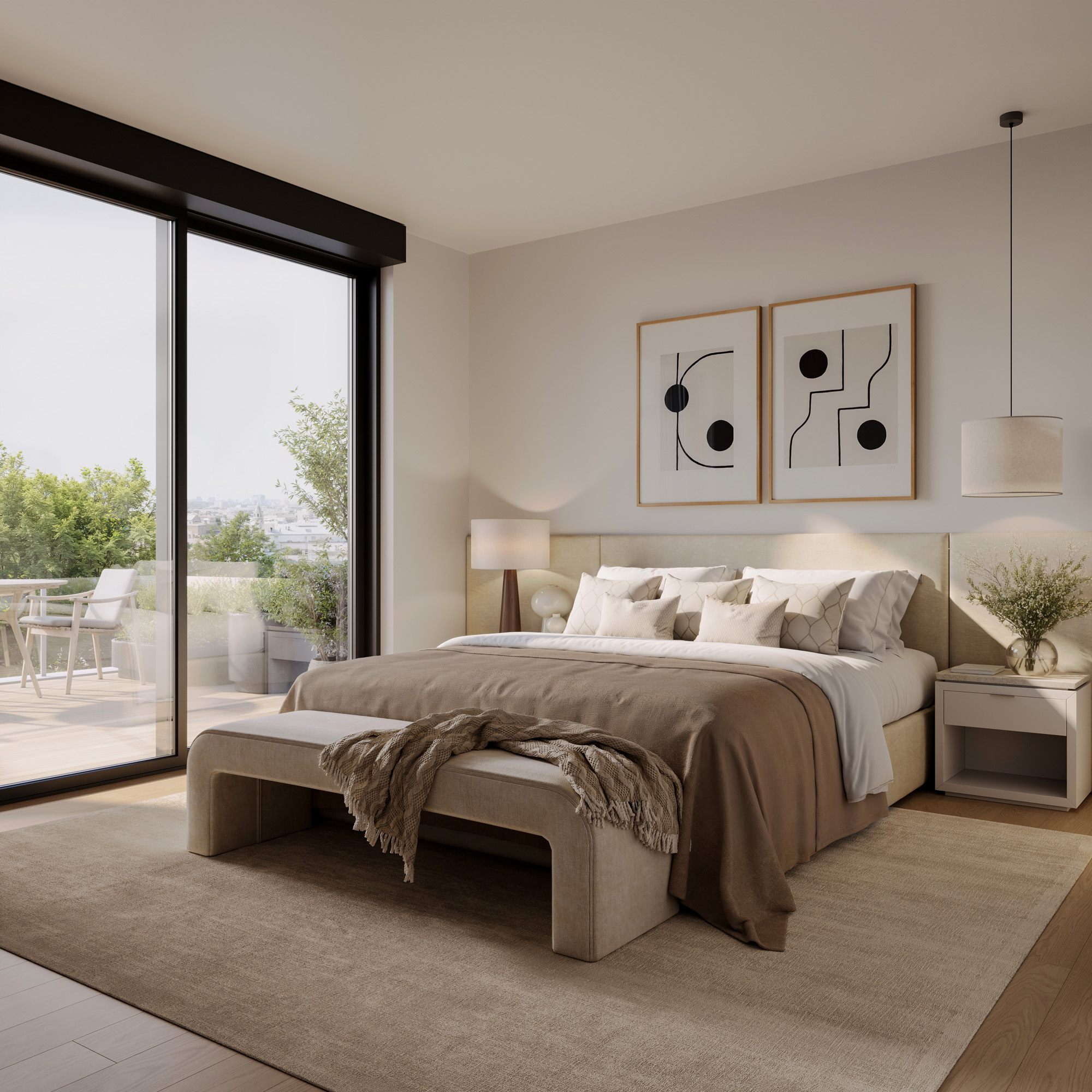 El trabajo incluye renders exteriores e interiores desarrollados para la presentación del proyecto y su comercialización, cuidando la iluminación natural, los materiales y la coherencia arquitectónica del conjunto residencial.