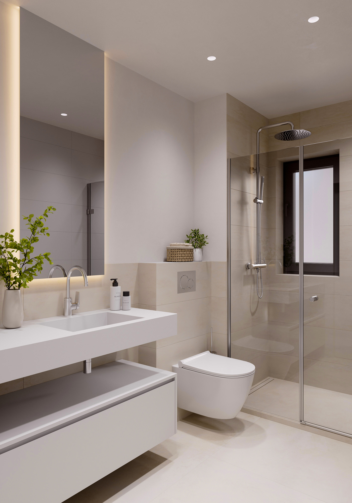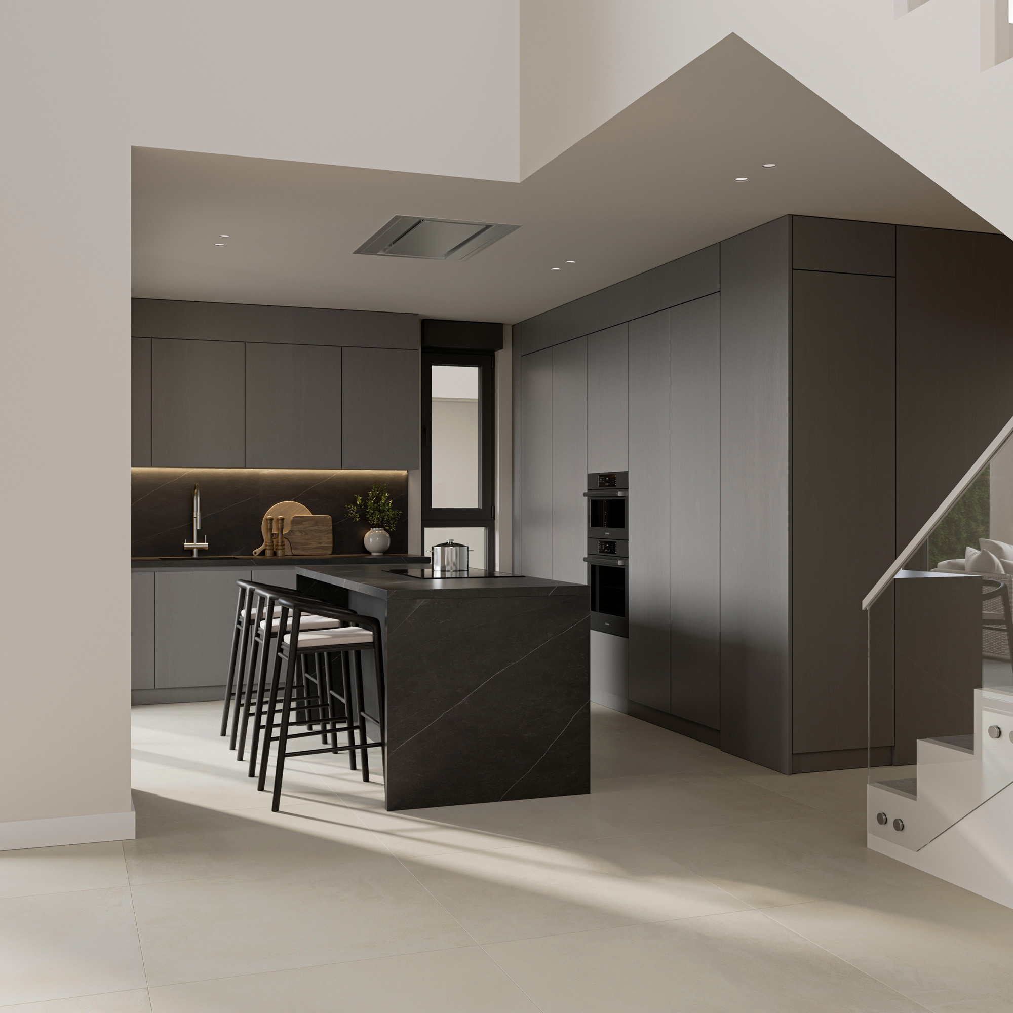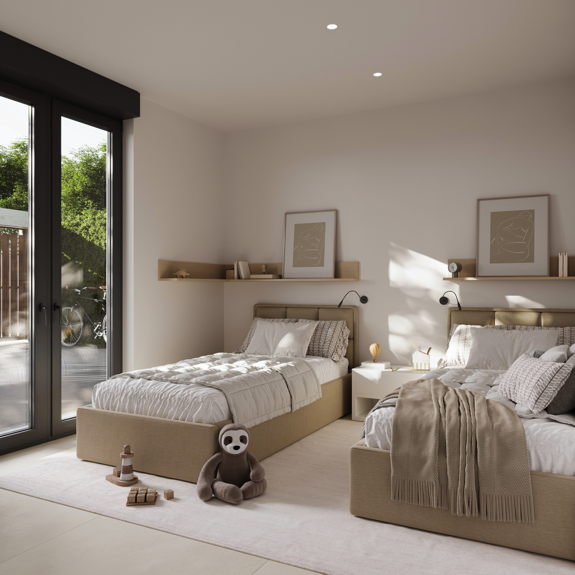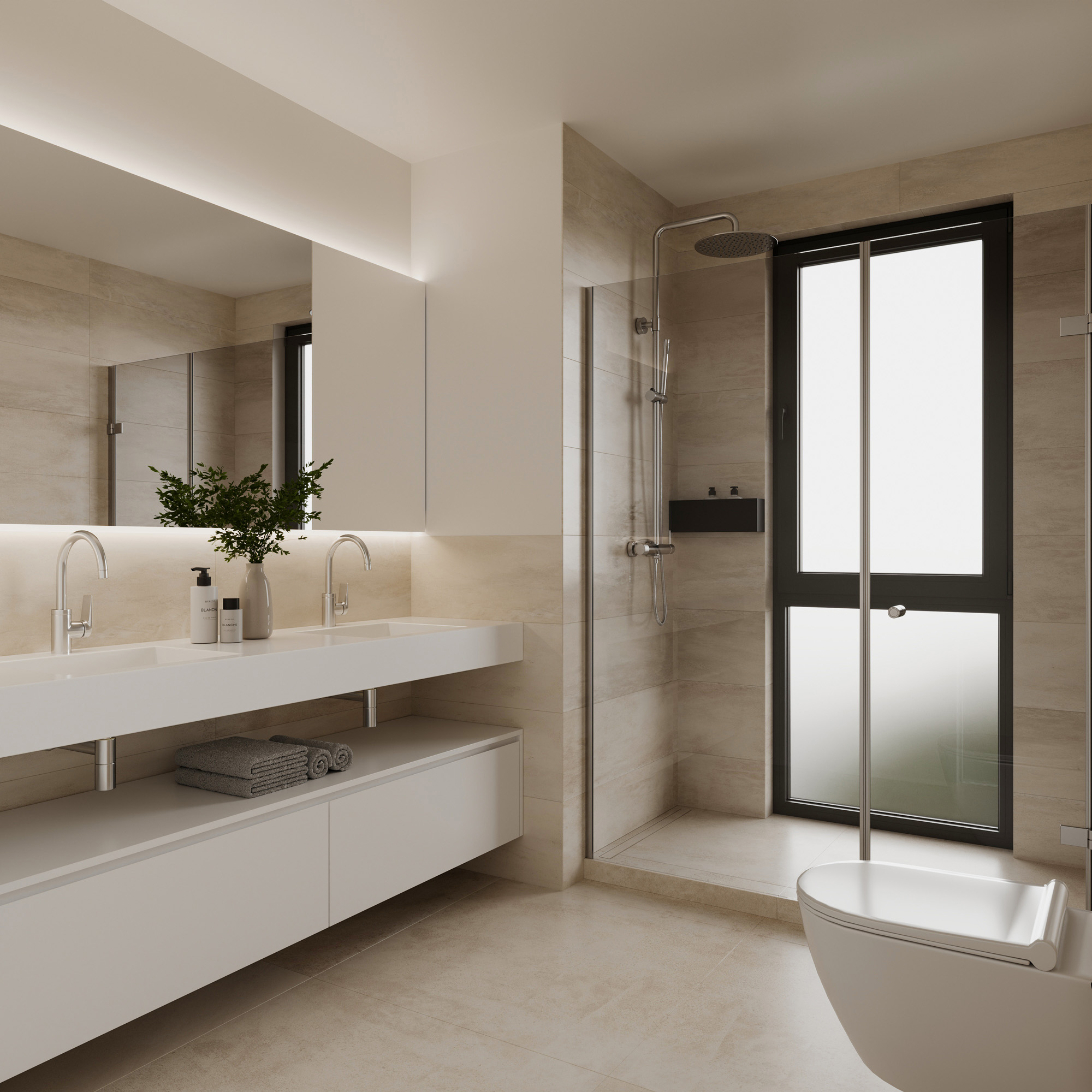 El trabajo incluye renders exteriores e interiores desarrollados para la presentación del proyecto y su comercialización, cuidando la iluminación natural, los materiales y la coherencia arquitectónica del conjunto residencial.